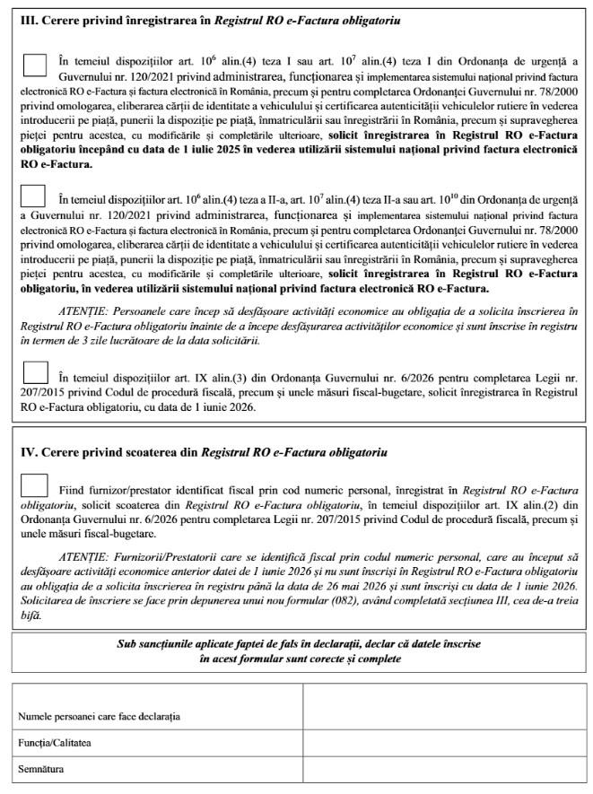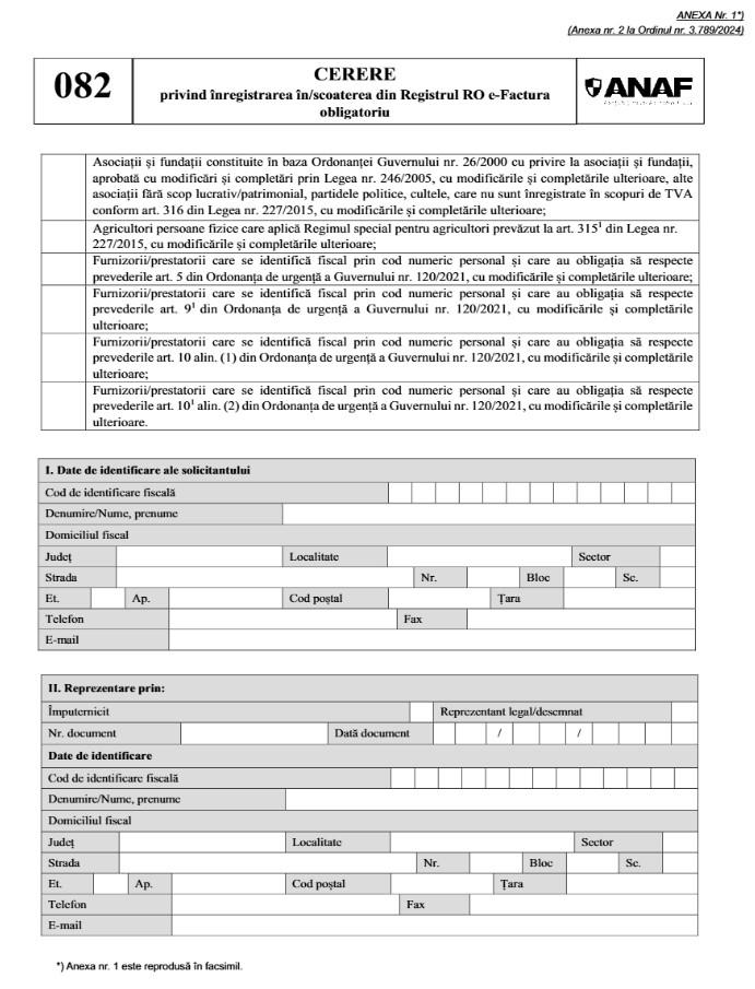 Ordinul modifică și completează procedura aprobată anterior prin Ordinul nr. 3.789/2024 și introduce un nou conținut pentru formularul (082) – „Cerere privind înregistrarea în/scoaterea din Registrul RO e-Factura obligatoriu”.