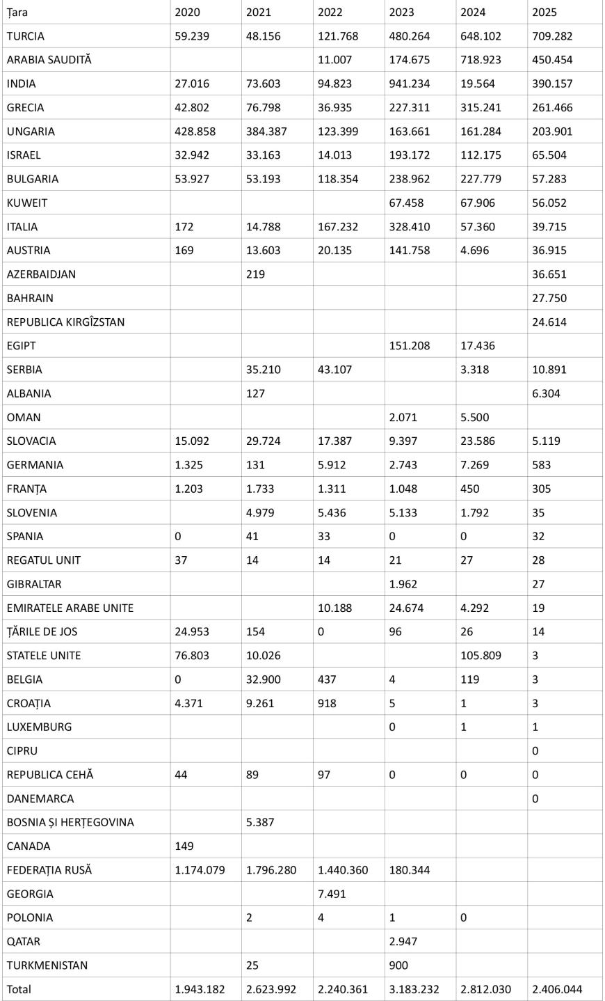 Datele INS arată o transformare radicală: în 2020, aproximativ 68% din motorina importată de România provenea din Rusia. Până în perioada 2024–2025, acest flux a dispărut aproape complet. În locul lui au apărut furnizori noi - Turcia, Arabia Saudită și India - ale căror exporturi către România au crescut exploziv.