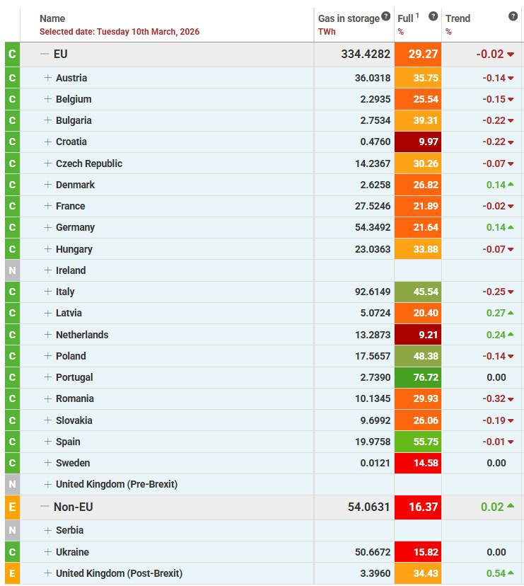 Datele privind stocurile de gaze arată că, la 10 martie 2026, depozitele UE conțineau aproximativ 334 TWh de gaz, echivalentul a 29,27% din capacitate.