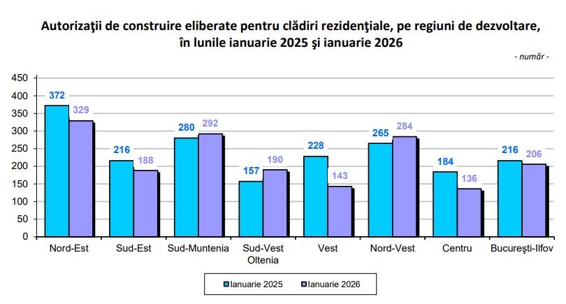 În luna ianuarie 2026 se evidenţiază o scădere a numărului de autorizaţii de construire eliberate pentru clădiri rezidenţiale comparativ cu luna precedentă (-150 autorizaţii). În profil teritorial, această scădere este reflectată în următoarele regiuni de dezvoltare: Vest (-85 autorizaţii), Centru (-48), Nord-Est (-43), Sud-Est (-28) şi Bucureşti-Ilfov (-10). Creşteris-au înregistrat în următoarele regiuni de dezvoltare: Sud-Vest Oltenia (+33 autorizaţii), Nord-Vest (+19) şi Sud-Muntenia (+12).